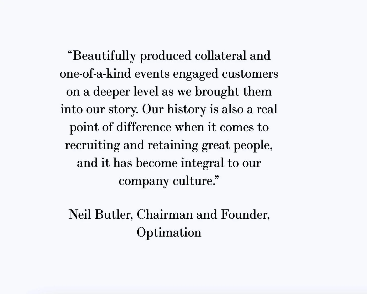 This major project included documenting Optimation’s history using private archives, records and photo collections; interviewing current and past customers and staff to create a timeline of highlights and milestones; sharing Optimation’s story through the press, website, newsletters and social media; and creating staff-focused collateral and activities that gave Optimation’s people a powerful sense of belonging and connection.